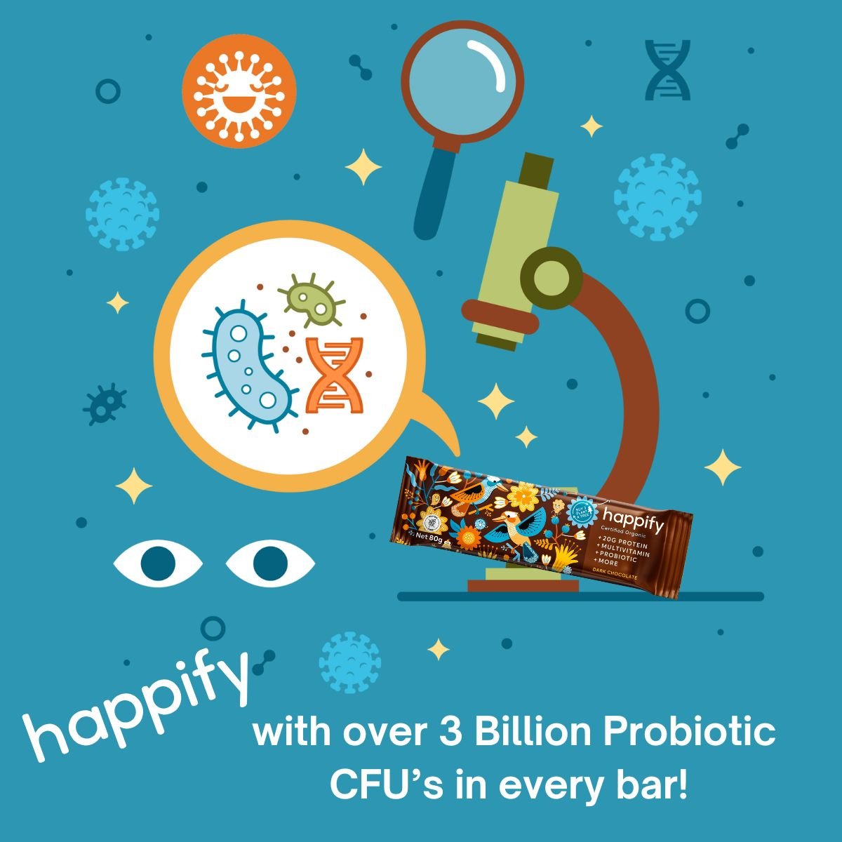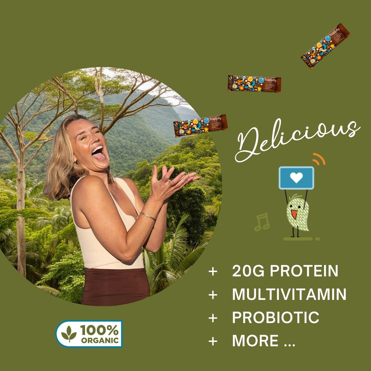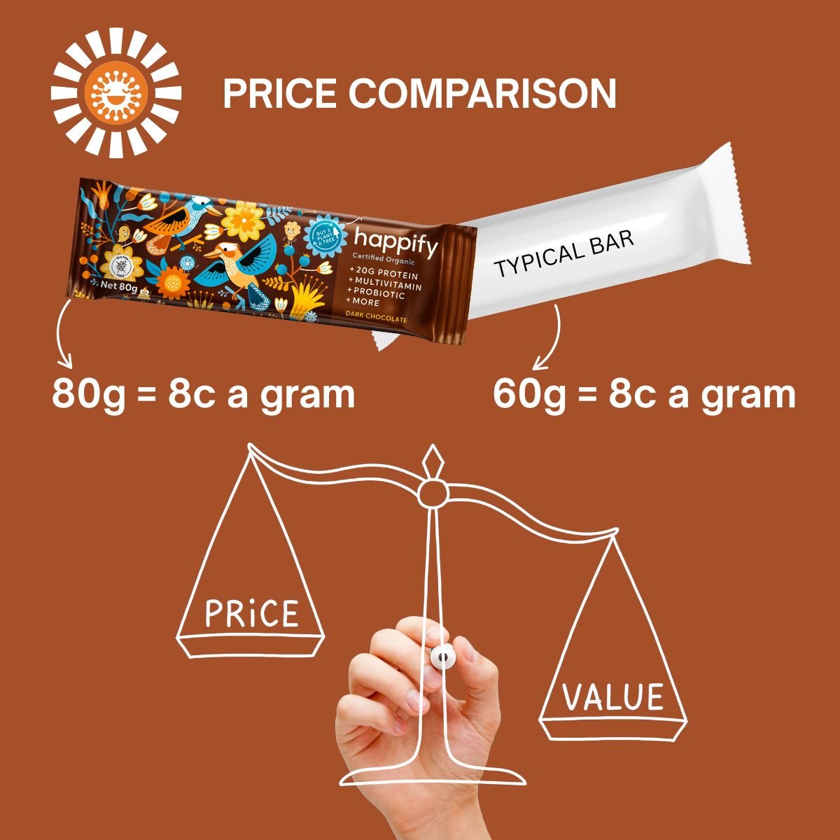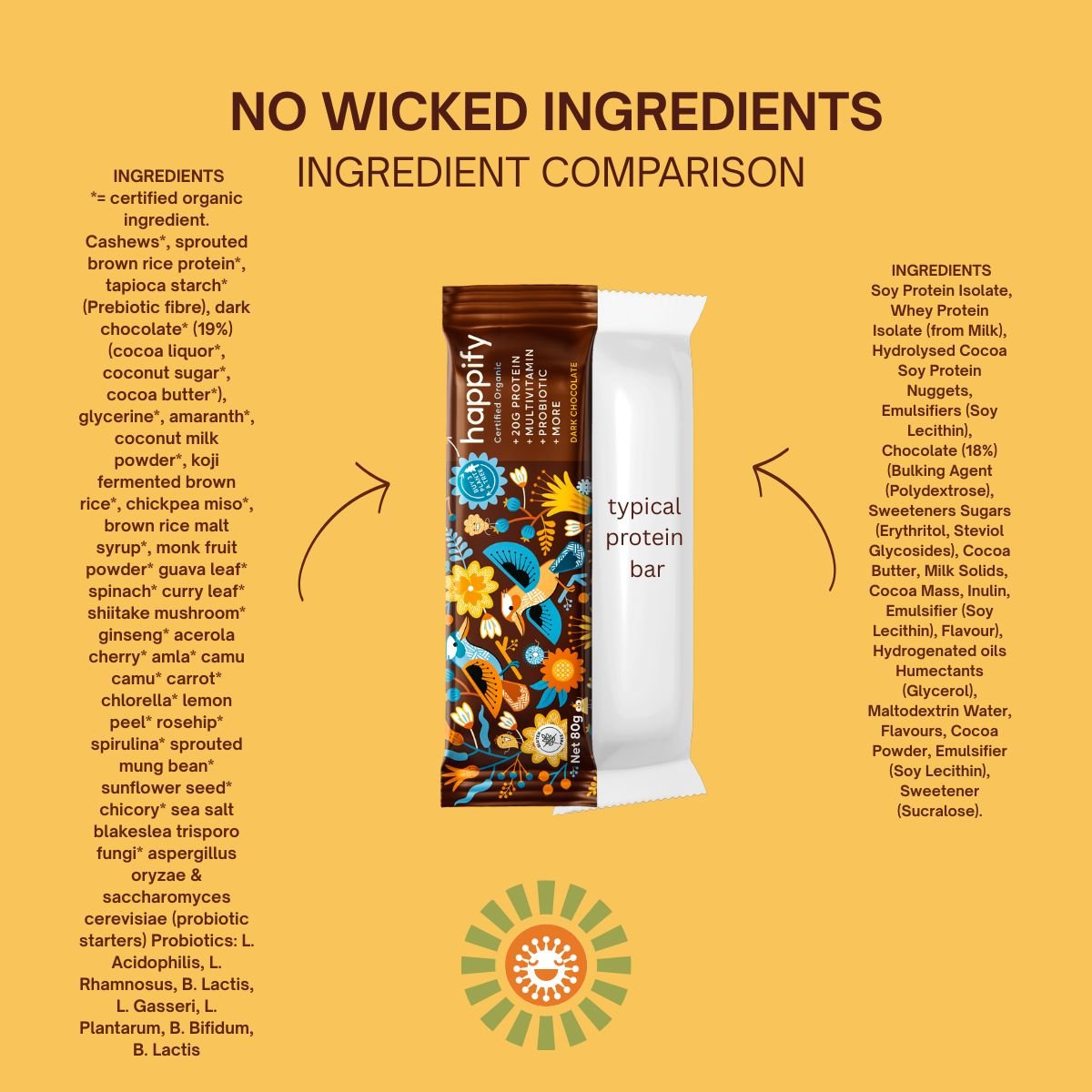 One Happify bar contains 20 grams of protein (with full amino acids profile), vitamins a, b complex, c, d & e, essential mineral electrolytes iron, magnesium & zinc, pre & probiotics, as well as an excellent source of fibre.